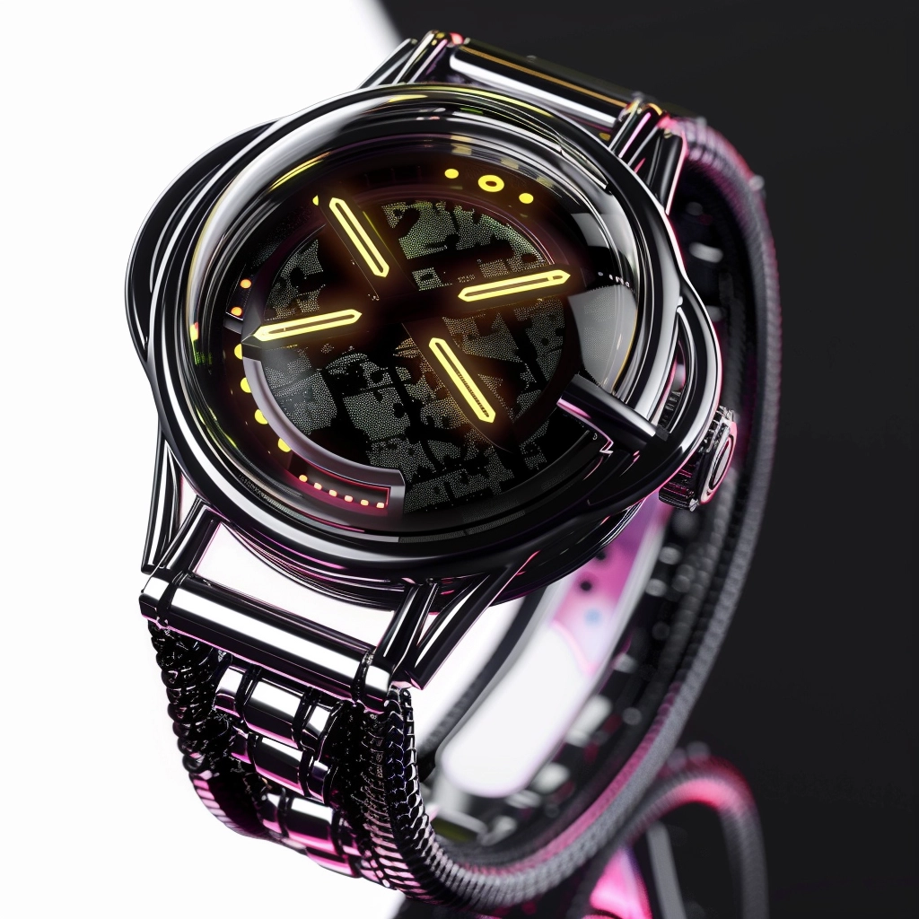 Groove Cycle is a speculative retro-futuristic watch inspired by the neon-drenched aesthetics of the ’80s and ’90s. Drawing influence from Daft Punk and chrome disco culture, the watch functions like a miniature record player—powered by music capsules that trigger a light-show on your wrist. Designed as a playful, wearable tribute to analog nostalgia and electronic music, it reimagines what timekeeping could feel like in a synth-powered future.