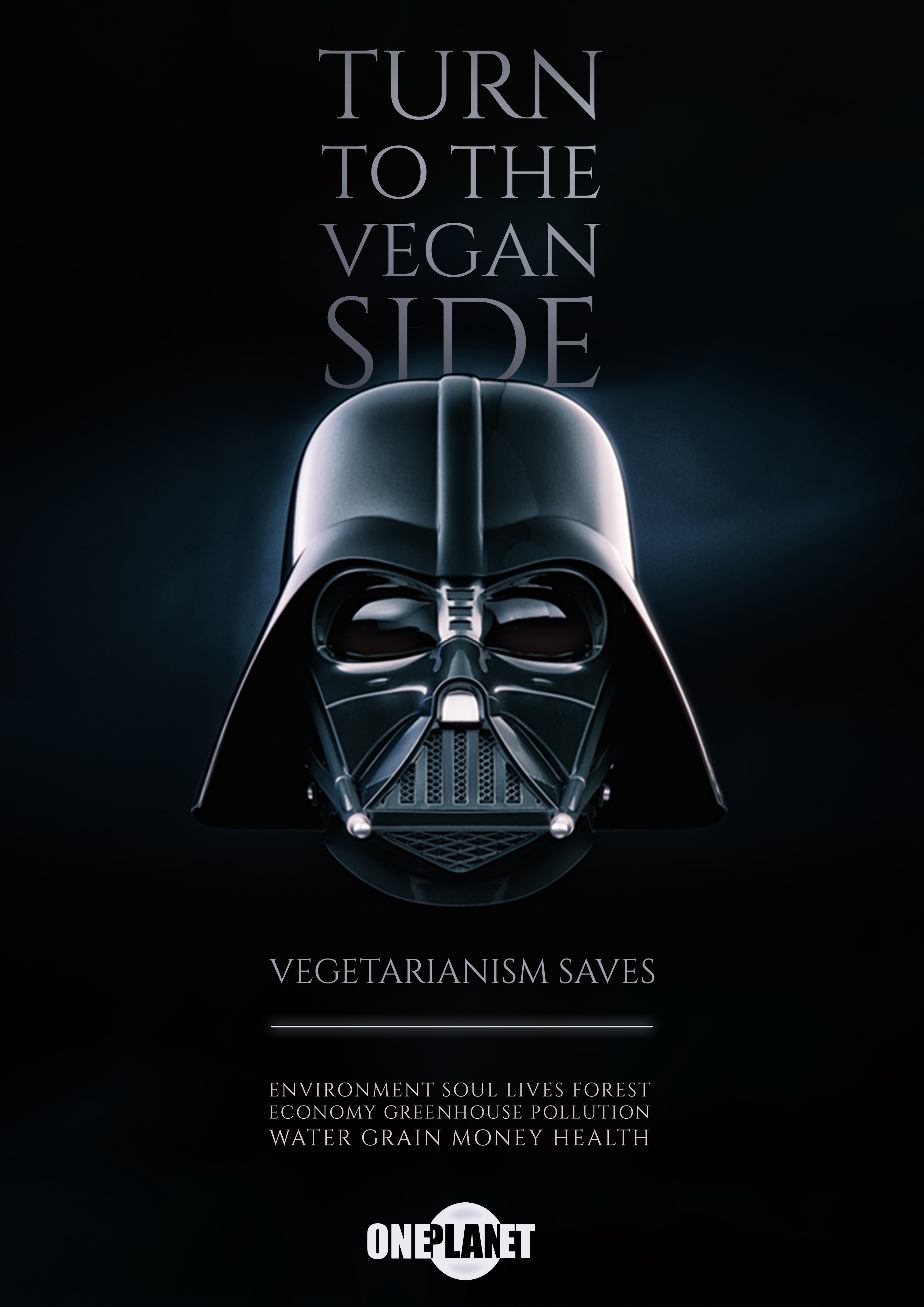 I created the posters entirely in Photoshop, using photo-bashing techniques—compositing, cutting, and manipulating images from various sources to build surreal, bold visuals. Whether it was a screaming chicken in a KFC bucket or Darth Vader inviting you to "Turn to the Vegan Side," the idea was to hook the viewer with humor, then land the message with impact.