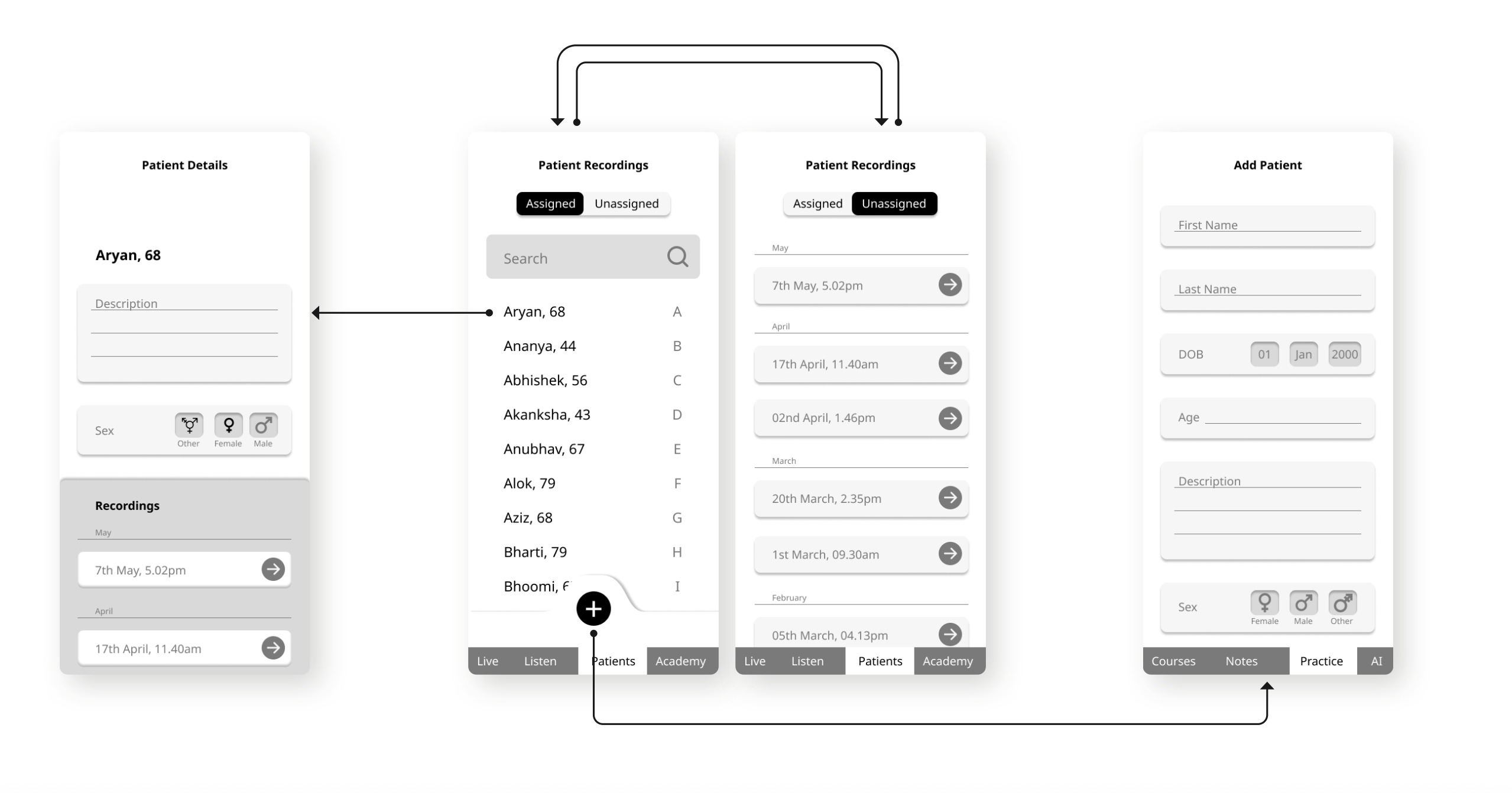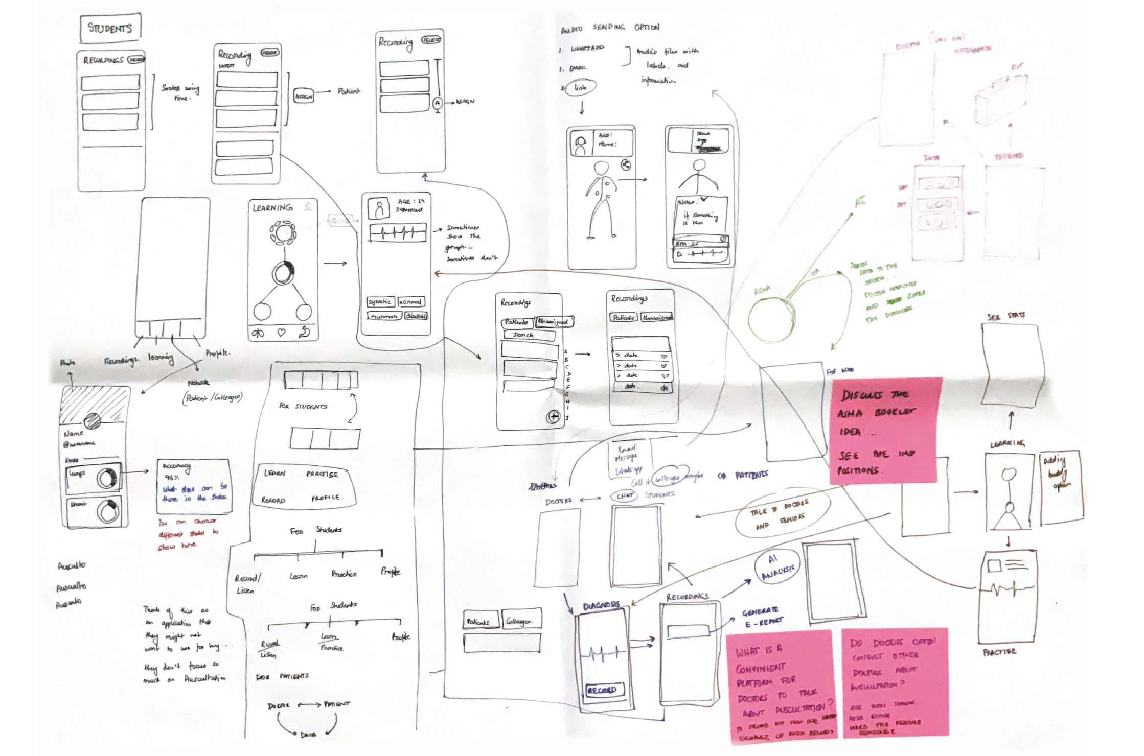 When it came to mapping interactions, I leaned more toward building process flows rather than traditional user flows. User flows typically focus on digital screen transitions, but in this case, that felt too narrow. I wasn’t designing just an app, I was designing a hybrid system where hardware and software needed to function in sync. For example, what happens when a user presses a button on the stethoscope? How does that connect to the recording interface on the app? Where does the data go, and how does it get shared with the doctor? These were the kinds of questions I was trying to answer. Creating process flows helped me visualize the entire journey from physical interaction to digital response while also sketching out how the underlying technology might operate behind the scenes.