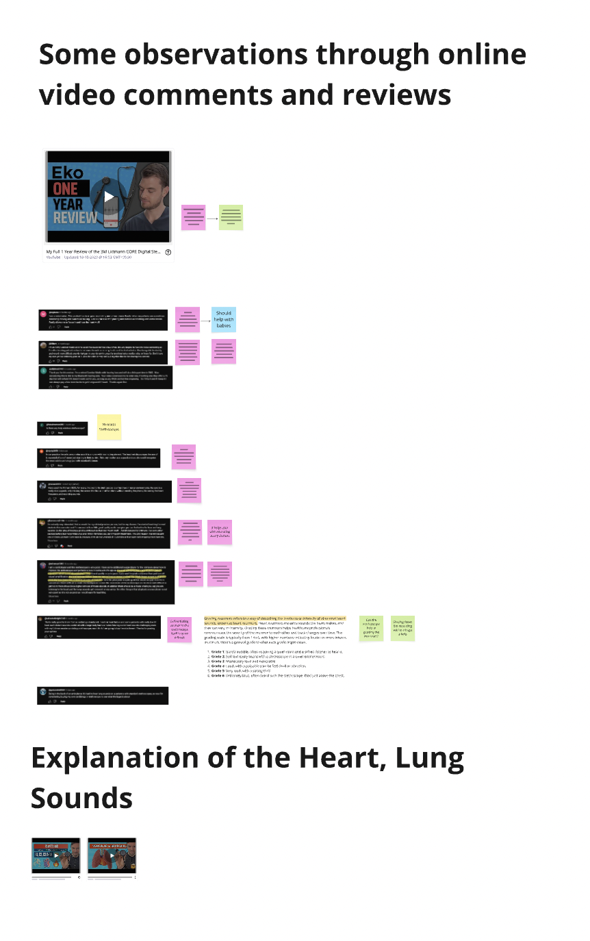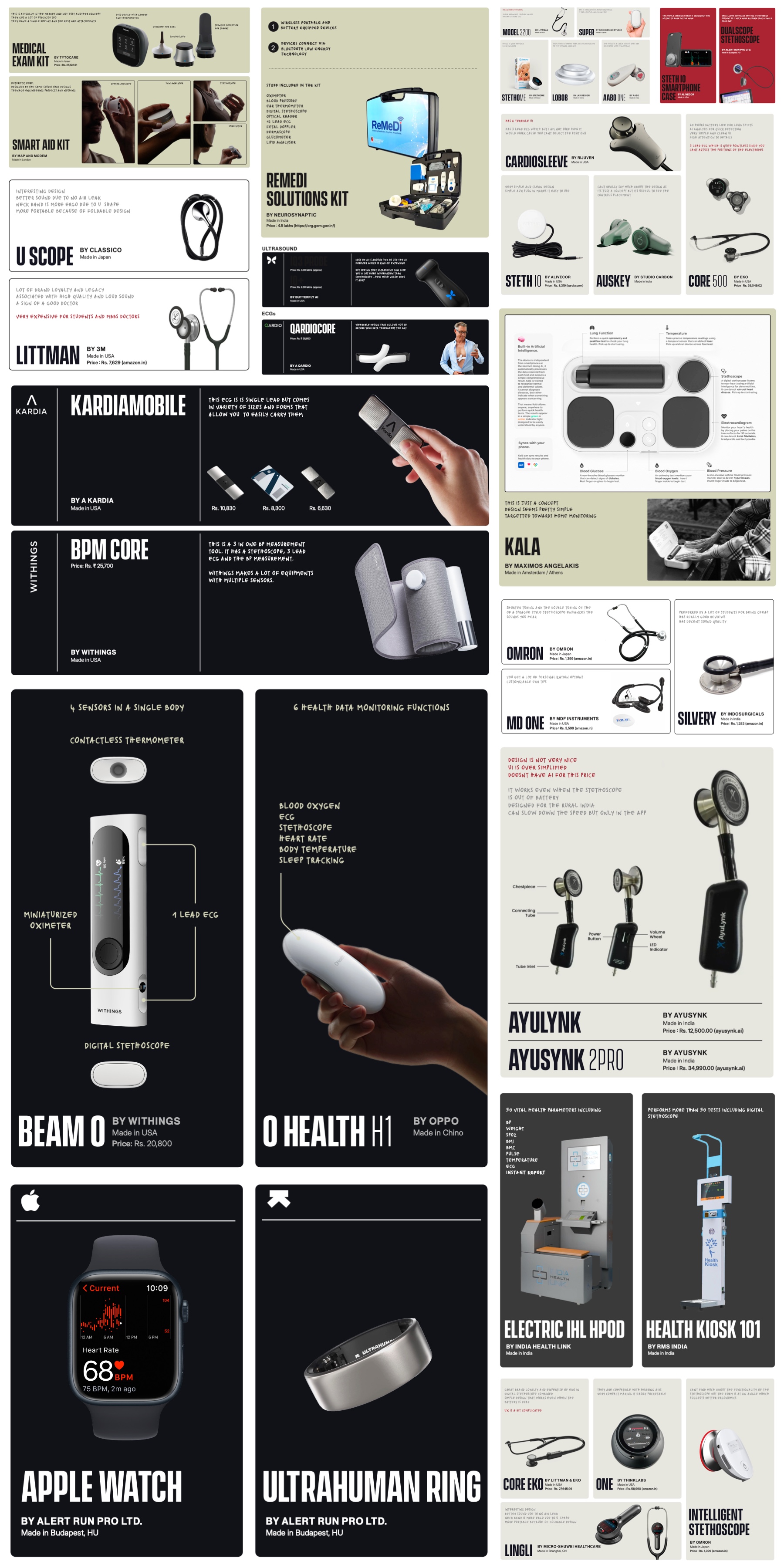 I started with secondary research: academic papers, Reddit threads, YouTube reviews, even Amazon feedback. Established brands like Eko and Littmann and Indian players like AyuSynk, all already offered devices with advanced features like noise cancellation or amplified audio. So where would we fit in? It would have been easy to simply list these as “improvements” for our prototype so that we are sort of same but the truth of the matter was that adoption of these devices was still low and these were all engineering fixes, they weren't design solution.