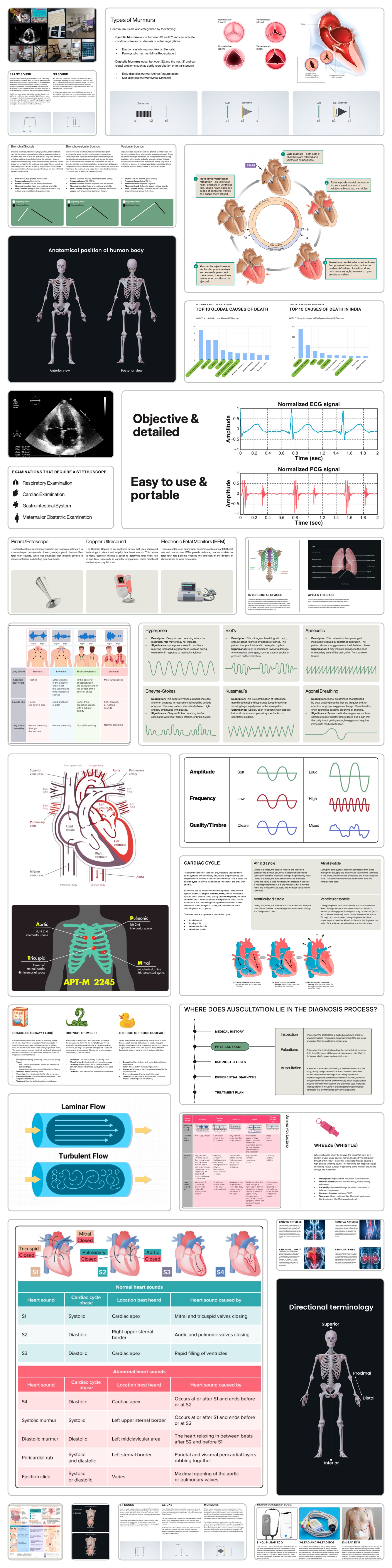 Auscultation is a non-invasive, first-line diagnostic technique used to assess internal body sounds, primarily of the respiratory, cardiovascular, gastrointestinal, obstetric, and vascular systems. These five categories became the lens through which I analyzed how digital stethoscopes could aid in screening and early detection, especially in remote or resource-constrained environments.