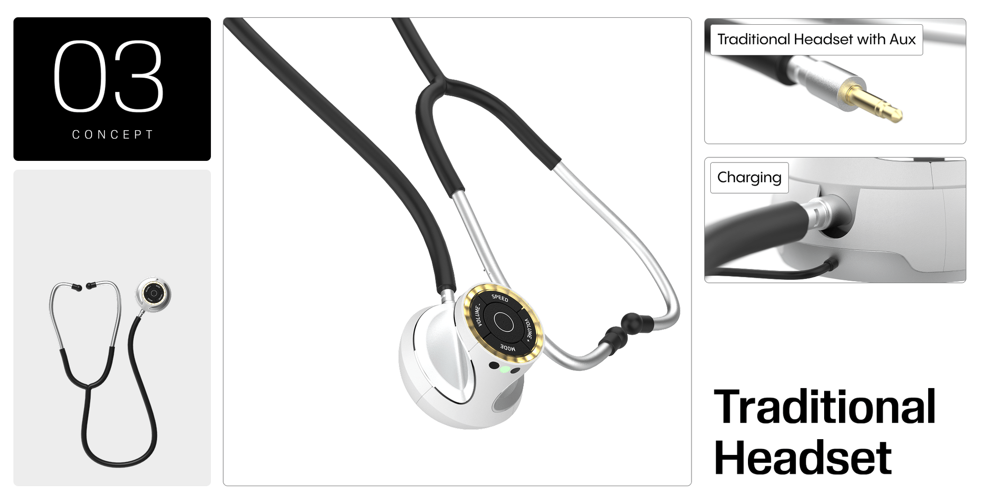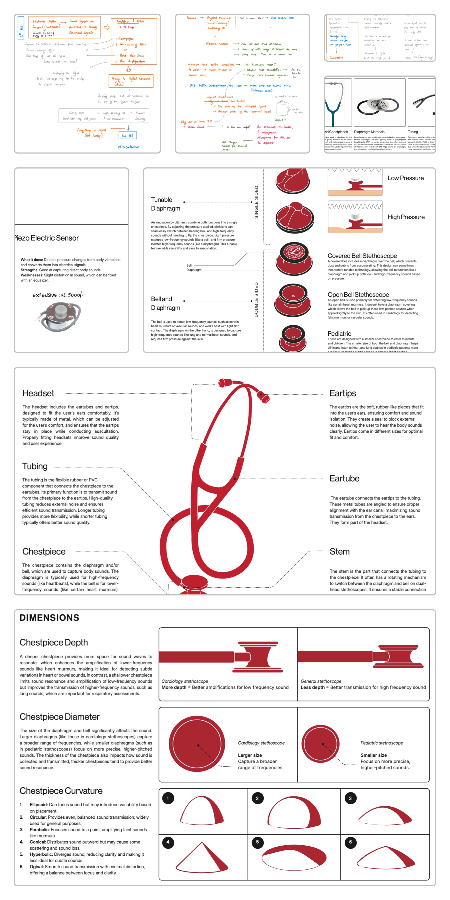Breaking down the stethoscope’s anatomy guided design choices. I studied chest piece types, materials, and weight for field usability; electronic sensors and batteries for clarity and endurance; and output modes like AUX, Bluetooth, or playback to balance cost with practicality.