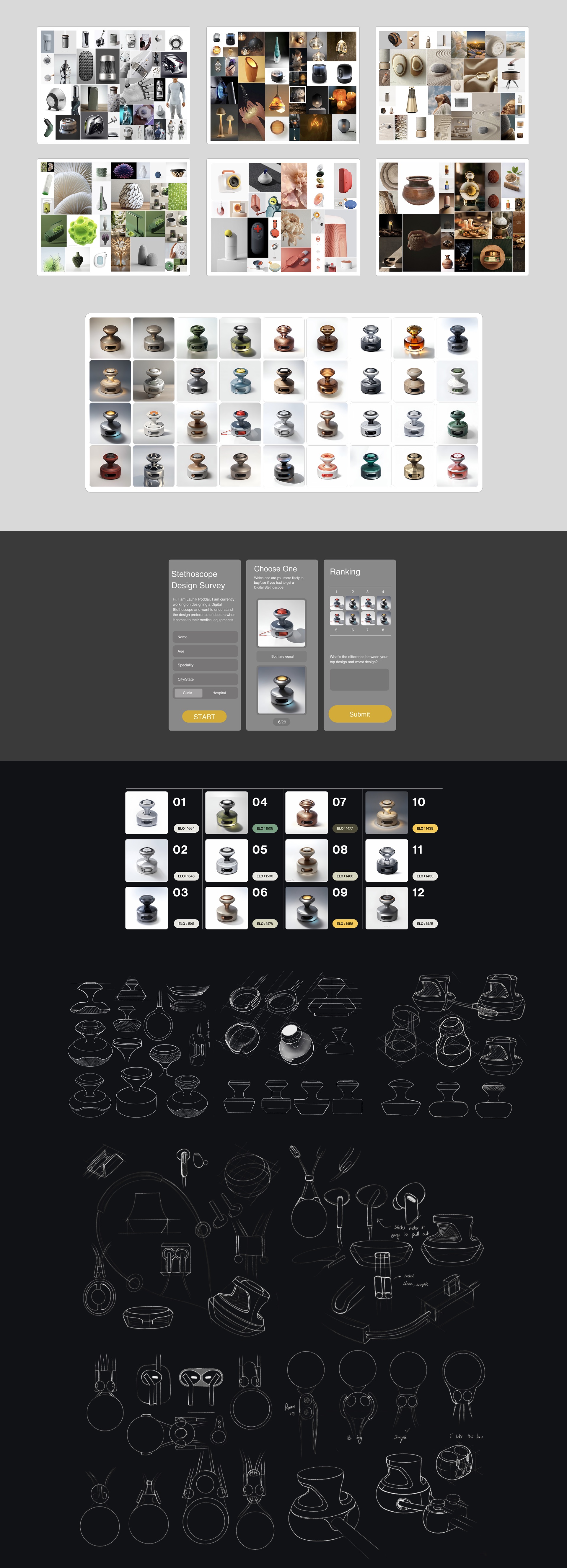 These early explorations included both familiar archetypes and more novel form factors, reflecting a balance between ergonomic comfort, manufacturing feasibility, and visual appeal. At this stage, we operated under a few assumptions, such as the need to fully enclose and protect the sensors, which were later revisited. Other guiding principles included hand feel, weight distribution, and introducing a sense of familiarity or trust, especially since stethoscopes are tools deeply embedded in the professional identity of healthcare workers.