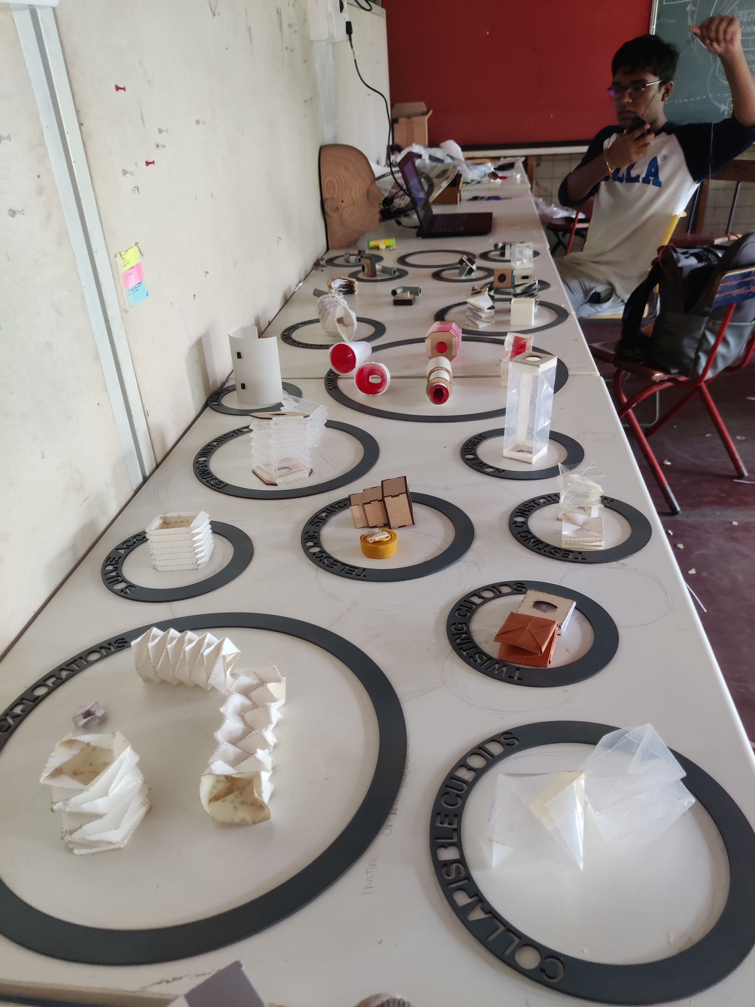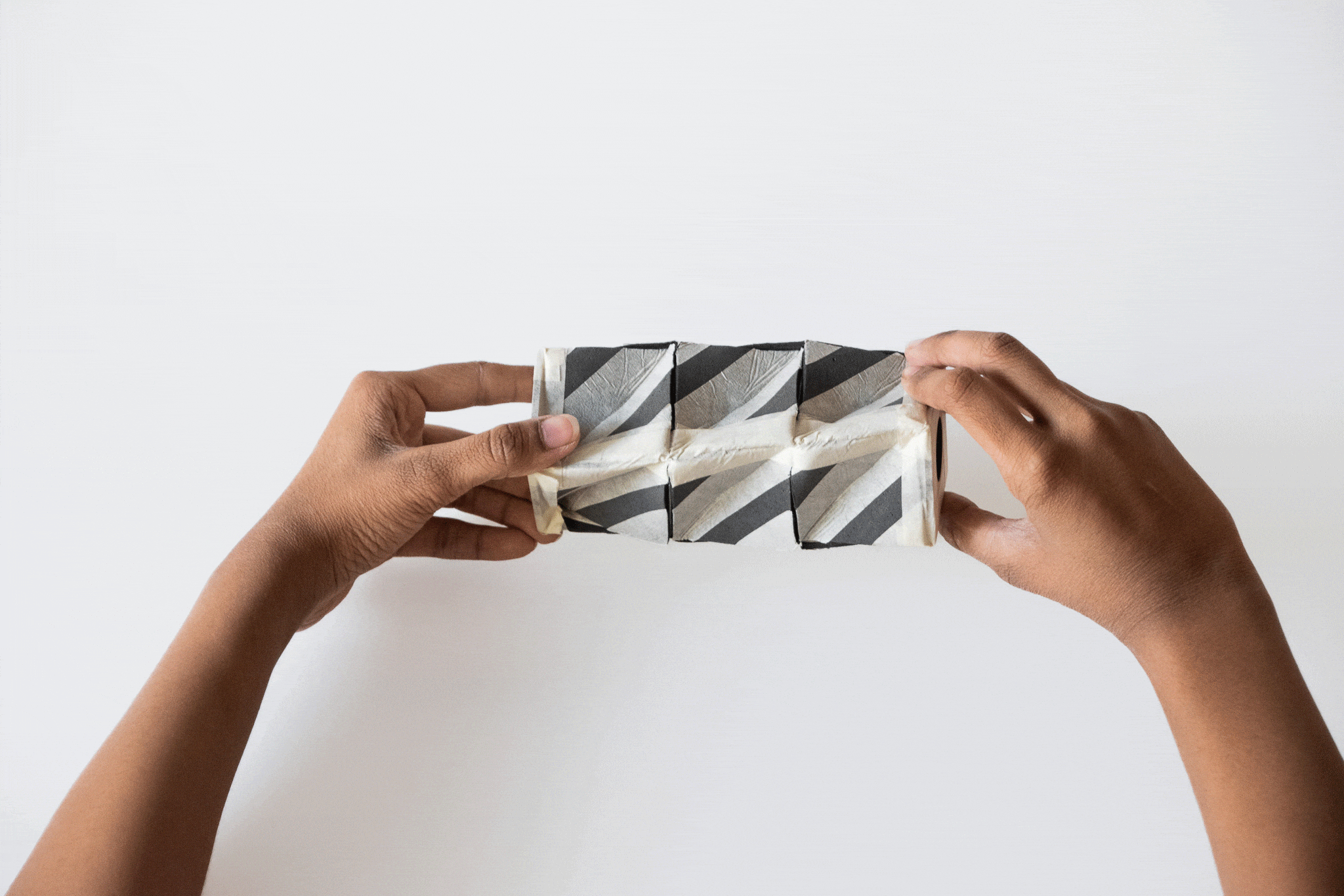 We evaluated Miura folds, wave geometries, square accordions, and twisting cuboids. Square accordion behaved like camera bellows and gave us predictable axial expansion. Twisting cuboids offered an intuitive “rotate-to-deploy” mental model, while some wave patterns achieved near-flat pocket profiles but risked internal cornering that could trap aerosol.