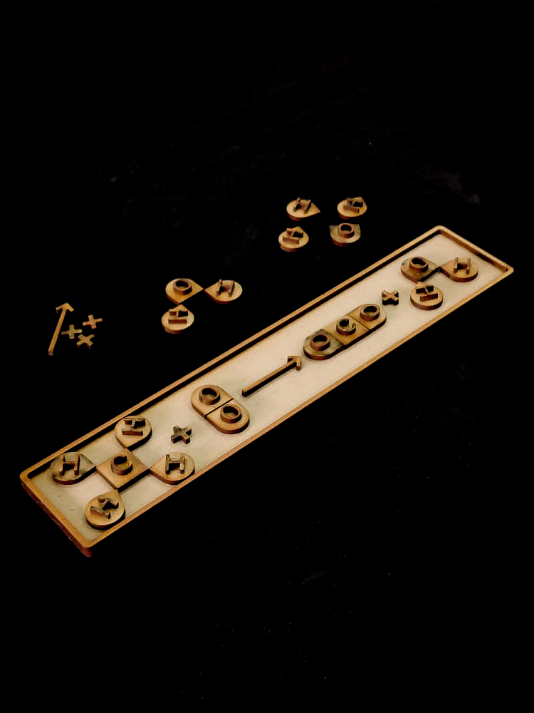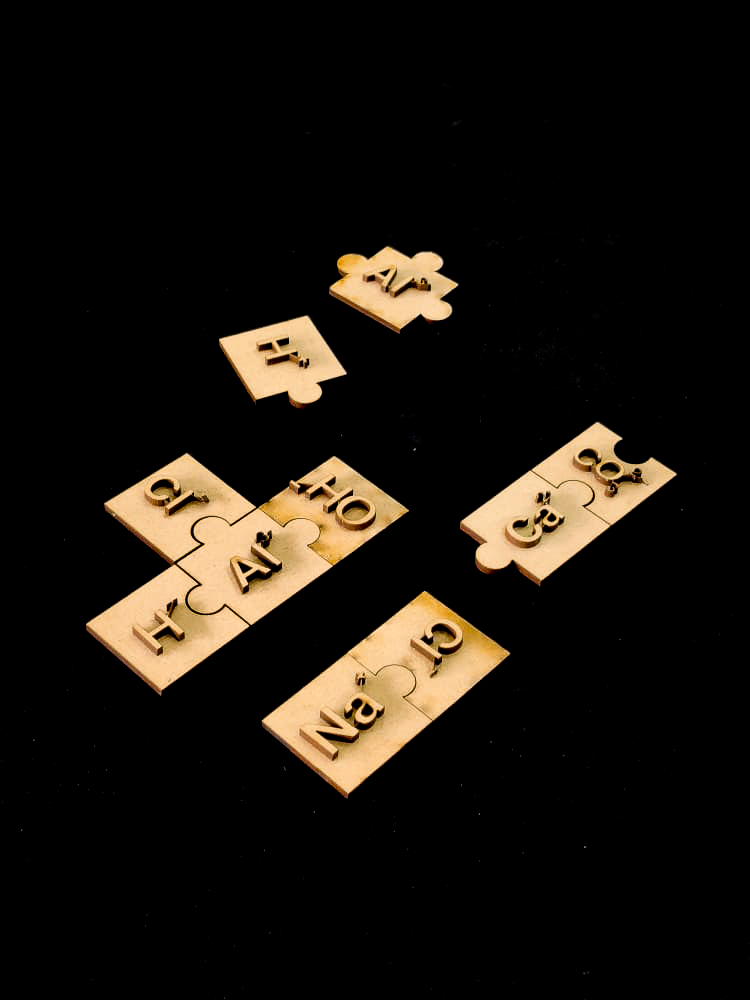 We created tactile tiles to explain atomic and covalent bonding. Element tiles encode valence via the number of usable corners, so learners can assemble molecules by aligning pieces. Interlocking shapes convey shared electrons, with paired connectors hinting at double bonds. It is intentionally simplified but gives a meaningful physical sense of how molecules form.