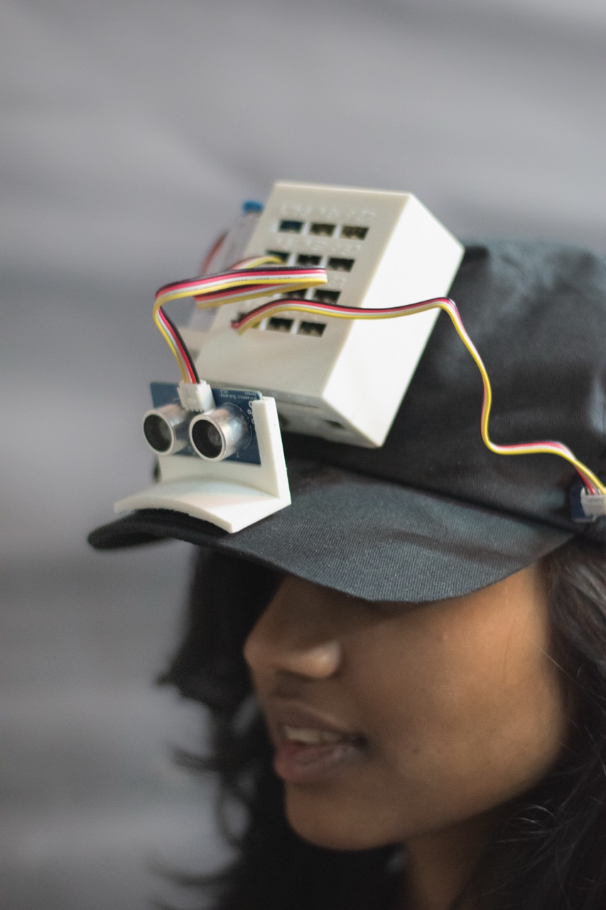 Buzzcap emerged as a head-worn assistive device that uses ultrasonic sensors to detect obstacles and buzzes gently to build spatial awareness through touch. We simplified the electronics with modular components and braille-labeled ports so visually impaired students could assemble the device themselves. It was designed not only as an alternative to the white cane, but as a skill-building experience where making was as important as using.